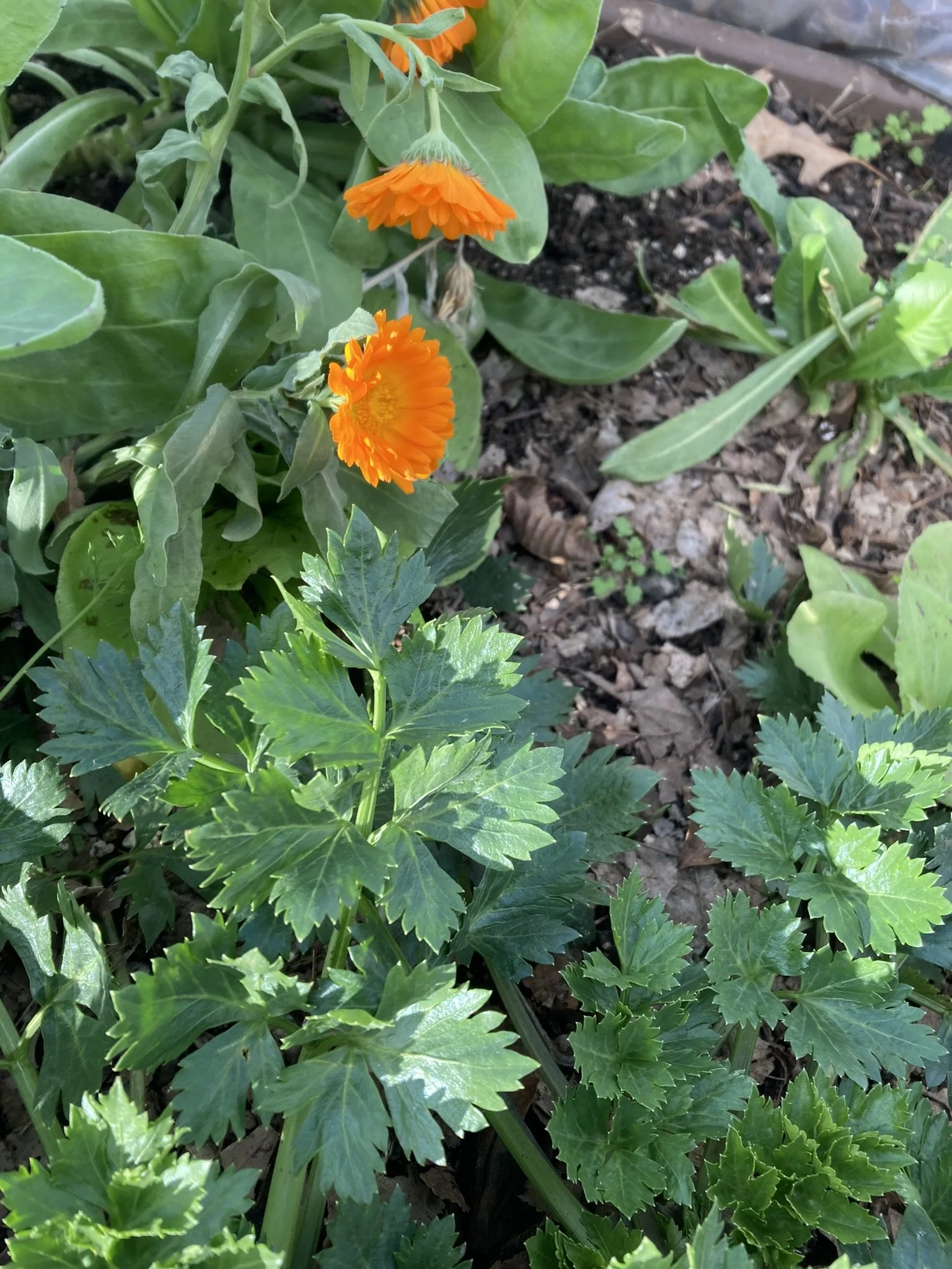 Calendula blooming in a mini-greenhouse in winter at The Imagined Garden, January 13, 2024